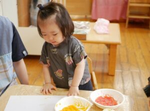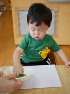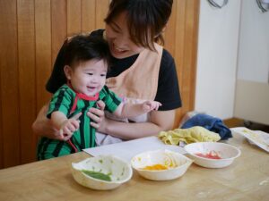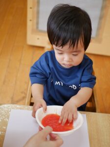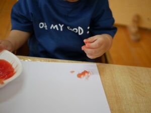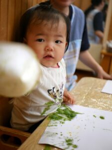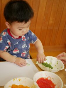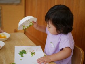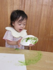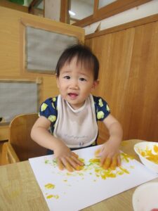 Iくんは保育士と一緒に野菜絵の具の匂いと色を楽しみました!