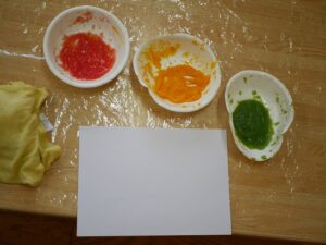 先日にこにこ組では野菜絵の具を行いました!にこにこ組のウッドデッキで育てたピーマンに加えてかぼちゃとトマトを野菜絵の具にしました!