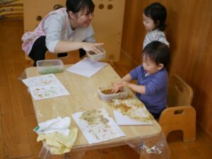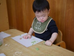 ”この紙じゃ足りない!”と言わんばかりにテーブルにまで野菜絵の具を伸ばしているお友だちもいましたよ!