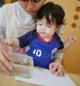 手のひらについた野菜絵の具をじーっと見ていたり、、、