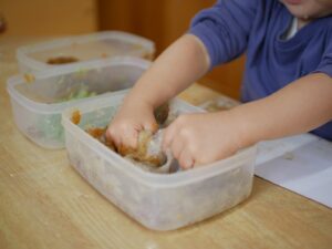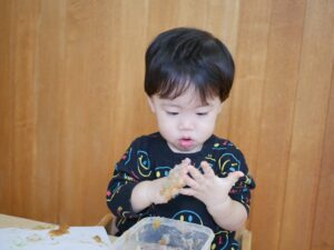 テーブルに来ると美味しそうな匂いがするけど、、、何だろう??という表情の子どもたち。
