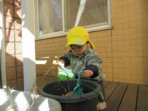 プランターの中にたくさん入っている落ち葉を見つけると、スコップを持って来て、かき混ぜていましたよ。