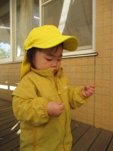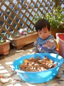 両手いっぱいに落ち葉を持って感触を確かめています。
