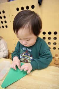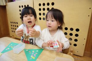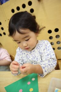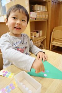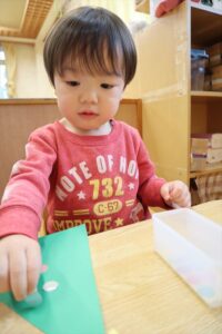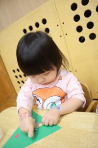 今までは台紙からシールを剥がすことや指先から台紙に貼ることが難しい様子の子もいましたが、以前に比べると指先が器用になり、スムーズに台紙から剥がしてペタペタと貼ることができるようになってきました。(成長を感じます~!)
