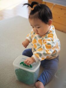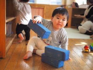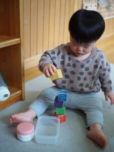 どんどんと重ねられる個数が増え、真剣表情で重ねては壊してを楽しんでいます♫